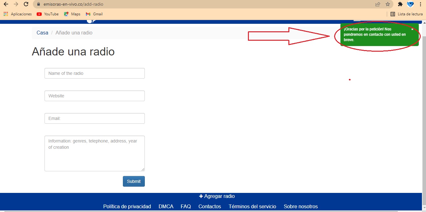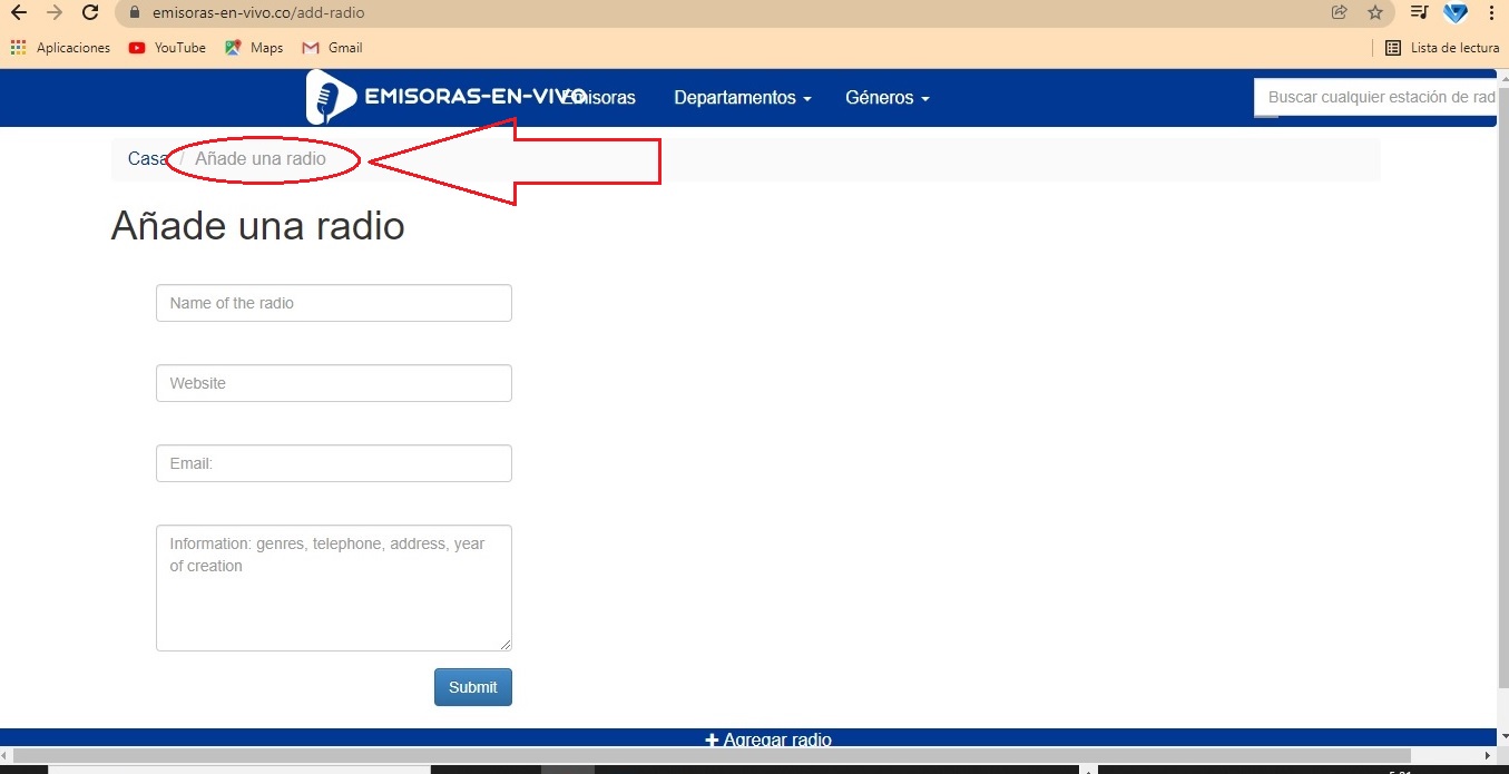 1. Para indexar su emisora de Radio Streaming en el directorio de radios Online emisoras emisoras-en-vivo.co usted deberá ingresar al siguiente enlace:https://emisoras-en-vivo.co/add-radio